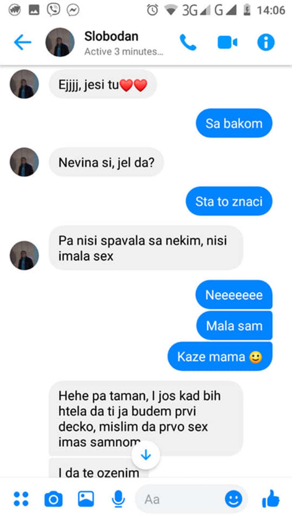 Od devojčice je, iako je znao da je maloletna, tražio golišave fotografije. Ispitivao ju je i da li ima oca, da li su njeni razvedeni, i insistirao na tome da ona treba da se uda za njega, da mu rodi dete, ali da mu pre upoznavanja pošalje gole slike.