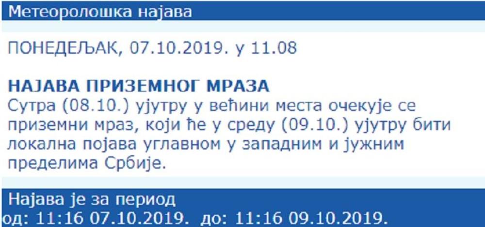 U sredu ujutro hladno, ponegde sa slabim prizemnim mrazem i maglom, u toku dana pretežno sunčano i osetno toplije.