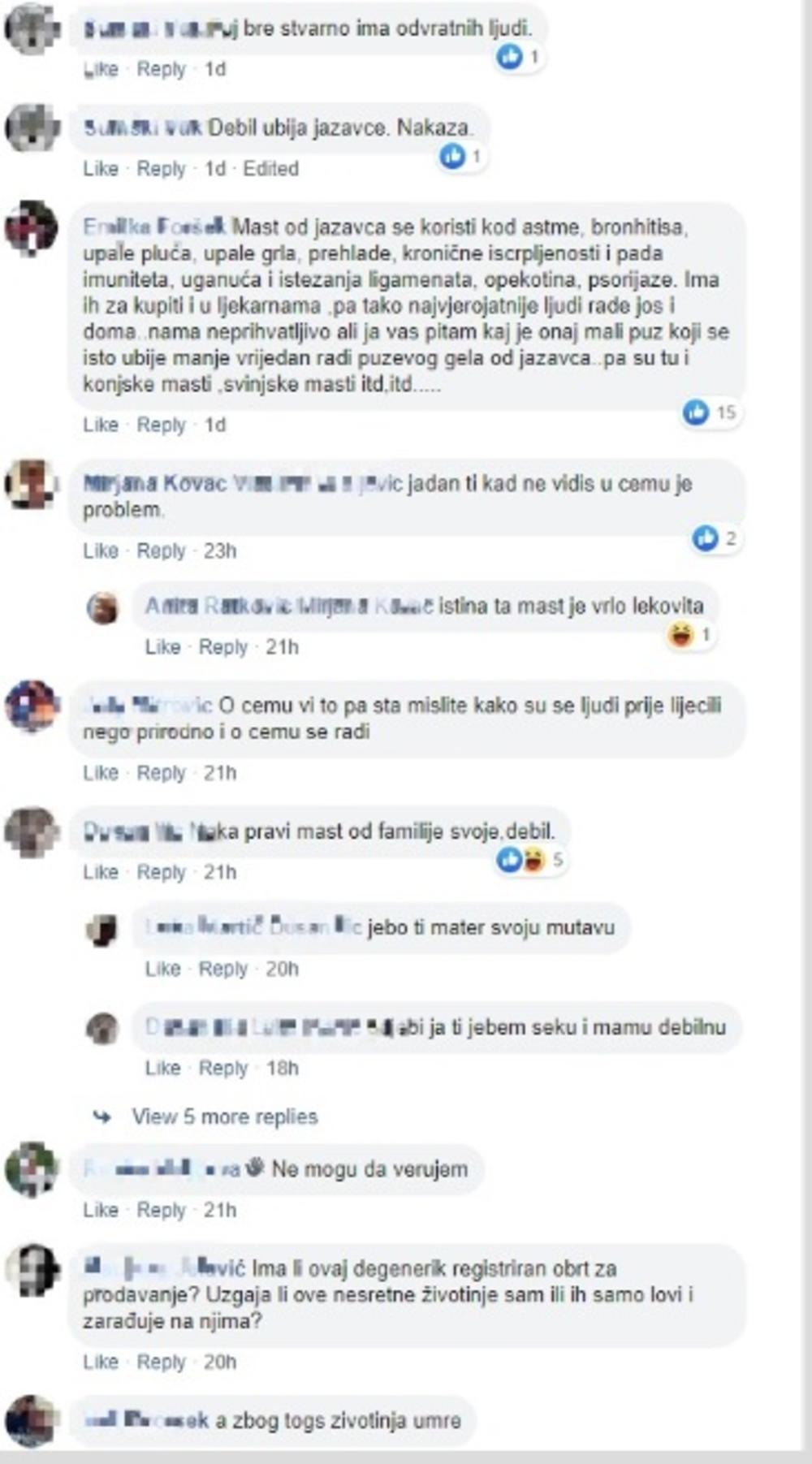 - Mast od jazavca se koristi kod astme, bronhitisa, upale pluća, upale grla, prehlade, kronične iscrpljenosti i pada imuniteta, uganuća i istezanja ligamenata, opekotina, psorijaze. Mogu da se kupe i u apotekama, ali mnogi ga prave kod kuće sami. Ja vas pitam da li je onaj mali puž koji se isto ubije manje vredan radi puževog gela od jazavca? Tu su i konjske masti ,svinjske masti itd,itd, napisala je jedana devojka na Fejsbuku.