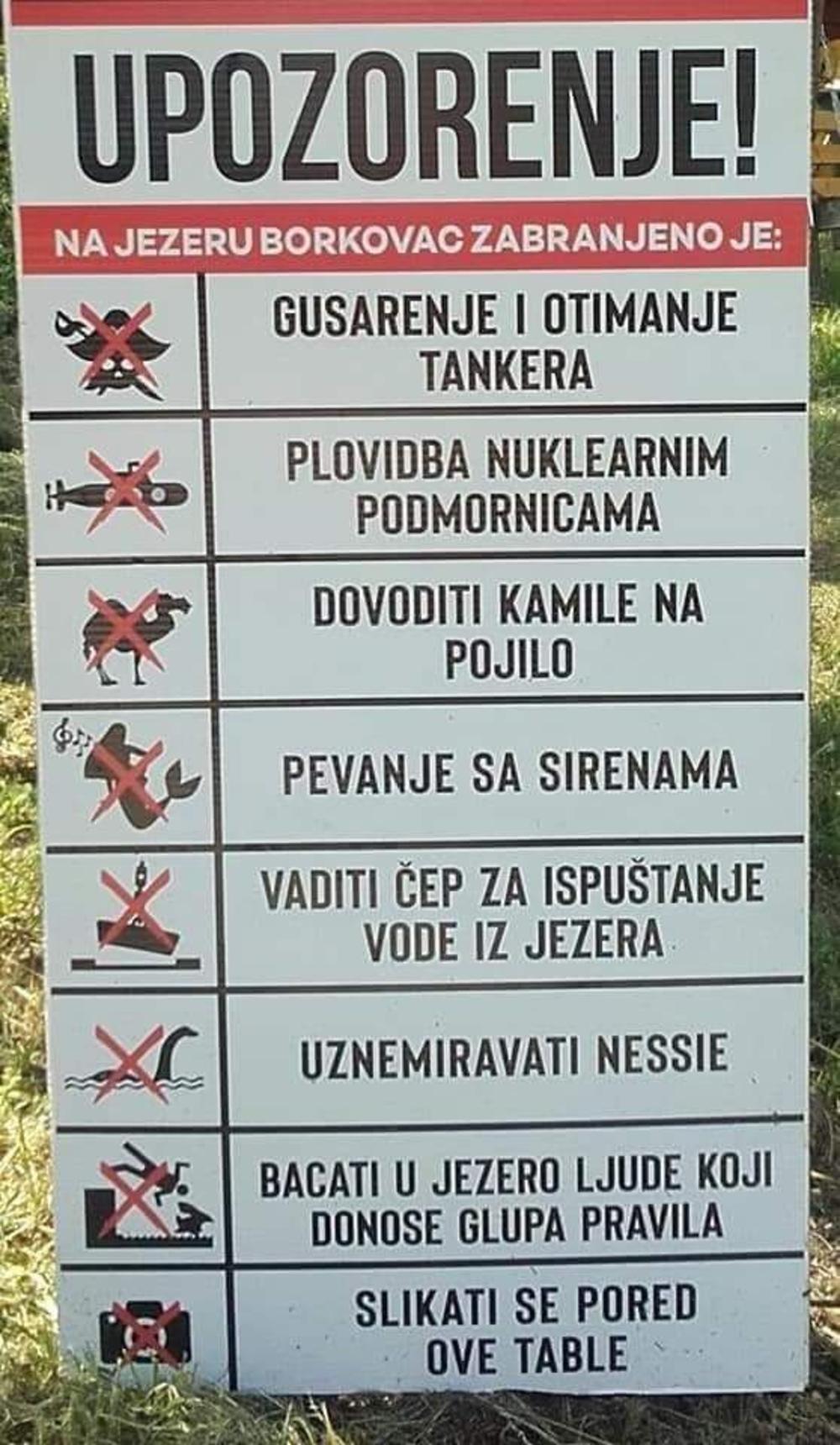 Naime, nadležni ljudi koji postavljaju gore pomenuta pravila, odlučili su da se našale i budu malo inovativniji od ostalih kolega. Tako su postavili tablu upozorenja, a ono što na ovom jezeru nije dozvoljeno, sigurni smo da na ostalim rekama i jezerima, verovatno jeste.