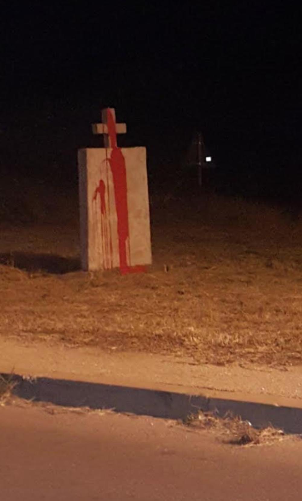 Inače spomenik u izgradnji je oskrnavljen bacanjem crvene farbe na njega što je sramota onih koji su to počinili jer su tim činom pljunuli na nedužne žrtve. Pošto je prvobitno bio na javnoj površini na kojoj nije odobreno njegovo podizanje, spomenik je pomeren na parcelu parohne crkve Pokrova Svete Bogorodice, koja je inače i podignuta na mestu stratišta pomenutih žrtava. Starešine ovog hrama, videvši sveukupnu situaciju, izašle su sa inicijativom, da je spomeniku mesto upravo tu, što smo se mi složili i ispoštovali.