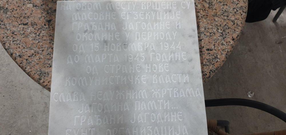 “na ovom mestu vršene su masovne egzekucije gradjana Jagodine i okoline u periodu novembar 1944.godine - mart 1945.godine od strane novih komunističkih vlasti. Slava nedužnim žrtvama. Jagodina pamti… Gradjani Jagodine. Bunt organizacija”.