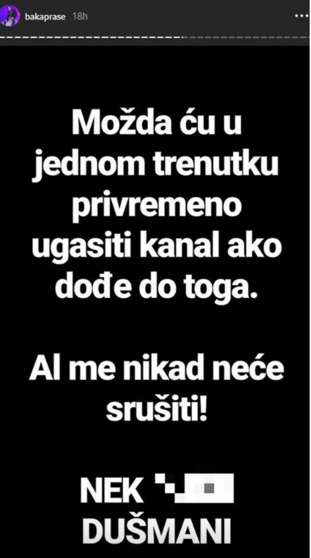 "Možda ću u jednom trenutku privremeno ugasiti kanal ako dođe do toga, ali me nikada neće srušiti" , napisao je Baka na svom Instagramu.