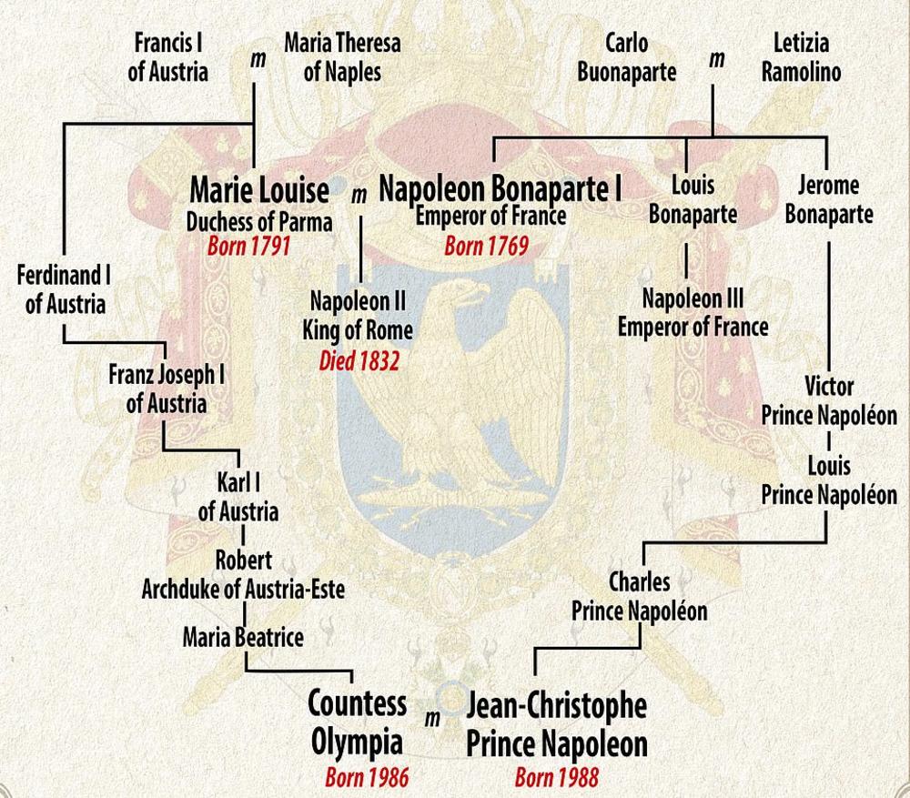 Princ Luis Napoleon je nedavno izjavio da oseća duboku posvećenost i dužnost prema Francuskoj, kao i da žudi da ispoštuje nasleđe svojih predaka. Napoleonov jedini sin umro je mlad, ostavivši jedinog naslednika Napoleona III, koji je vladao Francuskom između do 1870. godine i on je pradeda današnjeg mladoženje princa Luisa Napoleona.