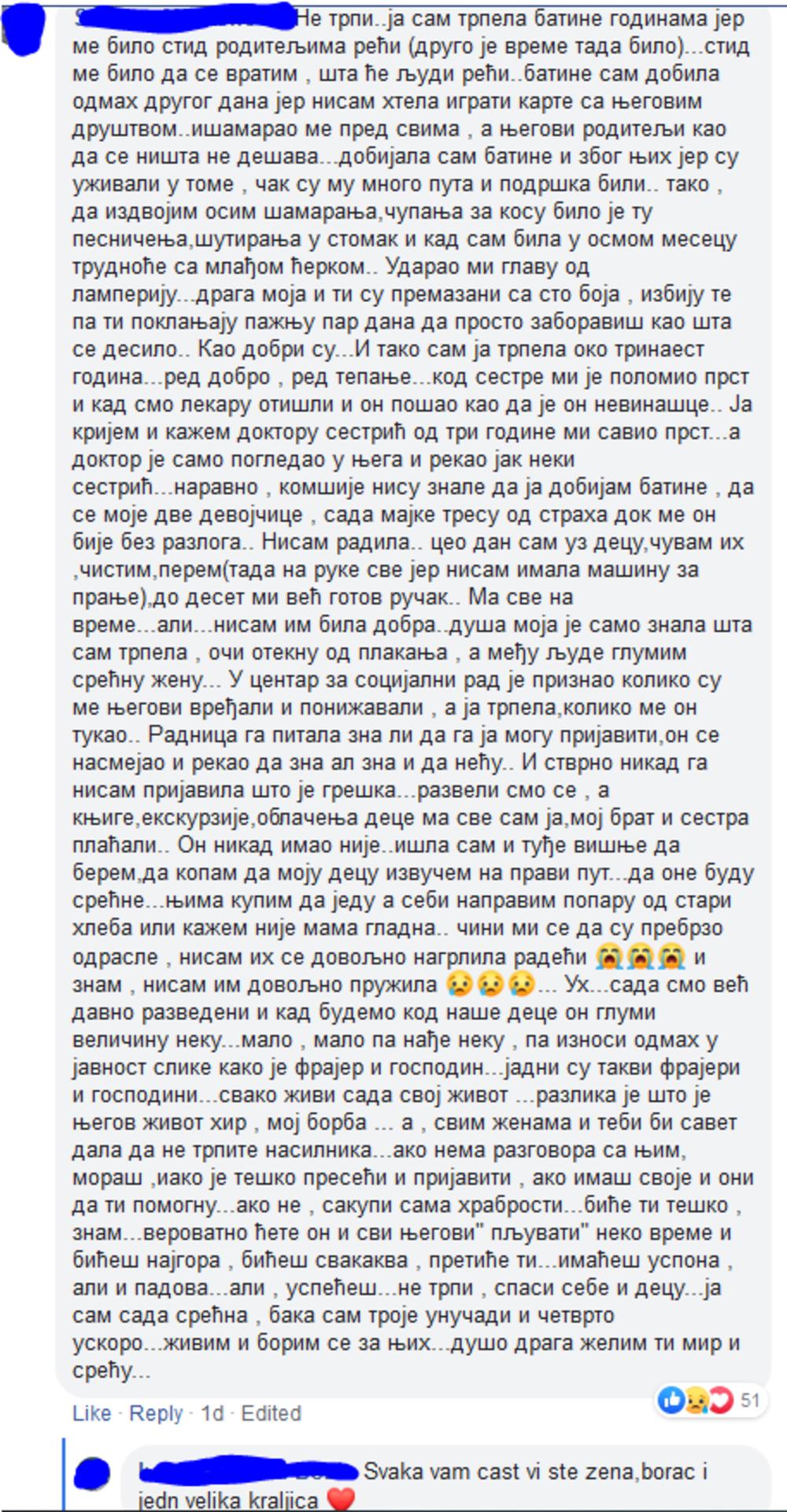 - Ne trpi..ja sam trpela batine godinama jer me bilo stid roditeljima reći (drugo je vreme tada bilo)...stid me bilo da se vratim , šta će ljudi reći..batine sam dobila odmah drugog dana jer nisam htela igrati karte sa njegovim društvom..išamarao me pred svima , a njegovi roditelji kao da se ništa ne dešava...dobijala sam batine i zbog njih jer su uživali u tome , čak su mu mnogo puta i podrška bili.. tako , da izdvojim osim šamaranja,čupanja za kosu bilo je tu pesničenja,šutiranja u stomak i kad sam bila u osmom mesecu trudnoće sa mlađom ćerkom.. Udarao mi glavu od lamperiju...draga moja i ti su premazani sa sto boja , izbiju te pa ti poklanjaju pažnju par dana da prosto zaboraviš kao šta se desilo.. Kao dobri su...I tako sam ja trpela oko trinaest godina...red dobro , red tepanje...kod sestre mi je polomio prst i kad smo lekaru otišli i on pošao kao da je on nevinašce.. Ja krijem i kažem doktoru sestrić od tri godine mi savio prst...a doktor je samo pogledao u njega i rekao jak neki sestrić...naravno , komšije nisu znale da ja dobijam batine , da se moje dve devojčice , sada majke tresu od straha dok me on bije bez razloga.. Nisam radila.. ceo dan sam uz decu,čuvam ih ,čistim,perem(tada na ruke sve jer nisam imala mašinu za pranje),do deset mi već gotov ručak.. Ma sve na vreme...ali...nisam im bila dobra..duša moja je samo znala šta sam trpela , oči oteknu od plakanja , a među ljude glumim srećnu ženu... U centar za socijalni rad je priznao koliko su me njegovi vređali i ponižavali , a ja trpela,koliko me on tukao.. Radnica ga pitala zna li da ga ja mogu prijaviti,on se nasmejao i rekao da zna al zna i da neću.. I stvrno nikad ga nisam prijavila što je greška...razveli smo se , a knjige,ekskurzije,oblačenja dece ma sve sam ja,moj brat i sestra plaćali.. On nikad imao nije..išla sam i tuđe višnje da berem,da kopam da moju decu izvučem na pravi put...da one budu srećne...njima kupim da jedu a sebi napravim poparu od stari hleba ili kažem nije mama gladna.. čini mi se da su prebrzo odrasle , nisam ih se dovoljno nagrlila radeći i znam , nisam im dovoljno pružila ... Uh...sada smo već davno razvedeni i kad budemo kod naše dece on glumi veličinu neku...malo , malo pa nađe neku , pa iznosi odmah u javnost slike kako je frajer i gospodin...jadni su takvi frajeri i gospodini...svako živi sada svoj život ...razlika je što je njegov život hir , moj borba ... a , svim ženama i tebi bi savet dala da ne trpite nasilnika...ako nema razgovora sa njim, moraš ,iako je teško preseći i prijaviti , ako imaš svoje i oni da ti pomognu...ako ne , sakupi sama hrabrosti...biće ti teško , znam...verovatno ćete on i svi njegovi" pljuvati" neko vreme i bićeš najgora , bićeš svakakva , pretiće ti...imaćeš uspona , ali i padova...ali , uspećeš...ne trpi , spasi sebe i decu...ja sam sada srećna , baka sam troje unučadi i četvrto uskoro...živim i borim se za njih...dušo draga želim ti mir i sreću... - poručila joj je žena.