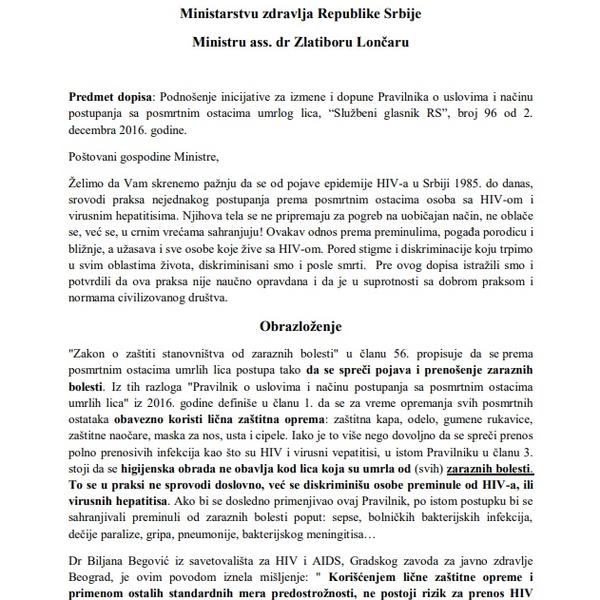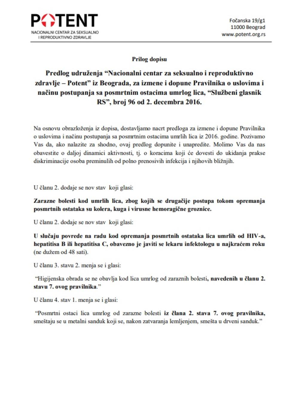 Samom inicijativom se predlaže izmena pojedinih odredbi Pravilnika o uslovima i načinu postupanja sa posmrtnim ostacima umrlog lica iz 2016. godine, i daje mišljenje doktora za HiV i AIDS prema kojem "ne postoji rizik za prenos HIV infekcije u kontaktu sa osobom koja je preminula od ili sa HIV infekcijom", kaže Branisalv Prokić iz udruženja "Potent"