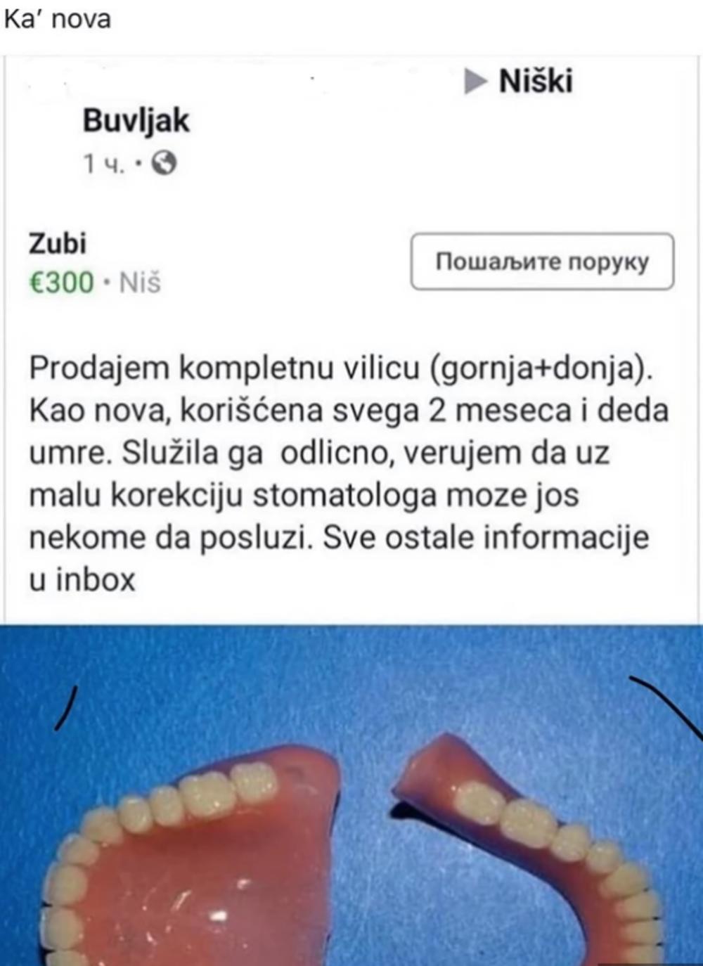 - Prodajem kompletnu vilicu (gornja + donja). Kao nova, korišćena svega dva meseca i deda umre. Služila ga odlično, verujem da uz malu korekciju stomatologa može još nekome da posluži. Sve ostale informacije u inboks - napisao je on.