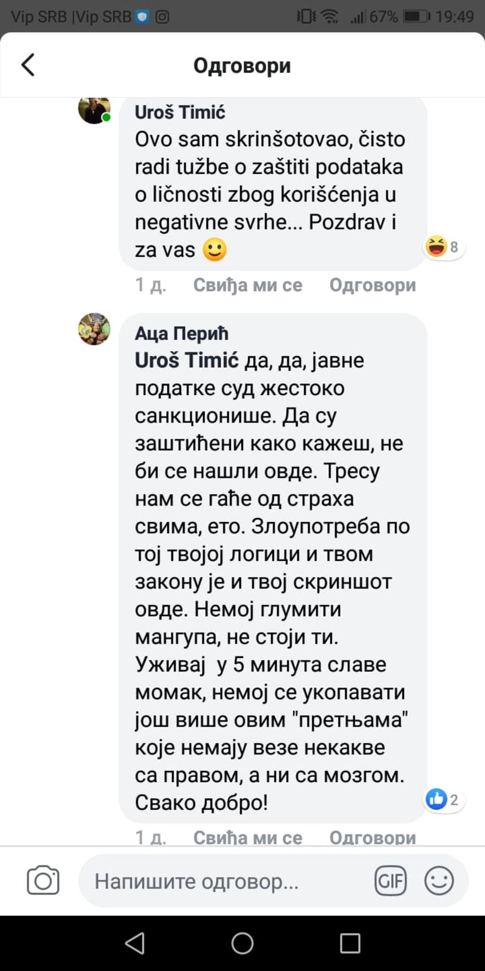 - Spominjem i J.B i M.I. Jedna od njih je direktno iznela moje radno mesto i time ugrozila ne samo mene već i kompletan kolektiv koji čine nas trojica i 20 ženskih randika. Biblioteka u kojoj radim nema obezbeđenje i ima slab video nadzor. M.I. je u jednom od komentara napisala da bi mi "sasula metak u lobanju", ali mislim da je taj komentar obrisan. Naravno, ne pre nego što sam uspeo da komentar uslikam u dostavim vam ga. T.P. je gospodin koji bi me strpao u koncentracioni logor, a D. B. "lupao šamare nogom". Naravno, nije isključeno da su svi do jednog, lažni profili. N. Š. jedan je od najaktivnijih profila u vređanju, objašnjava on.