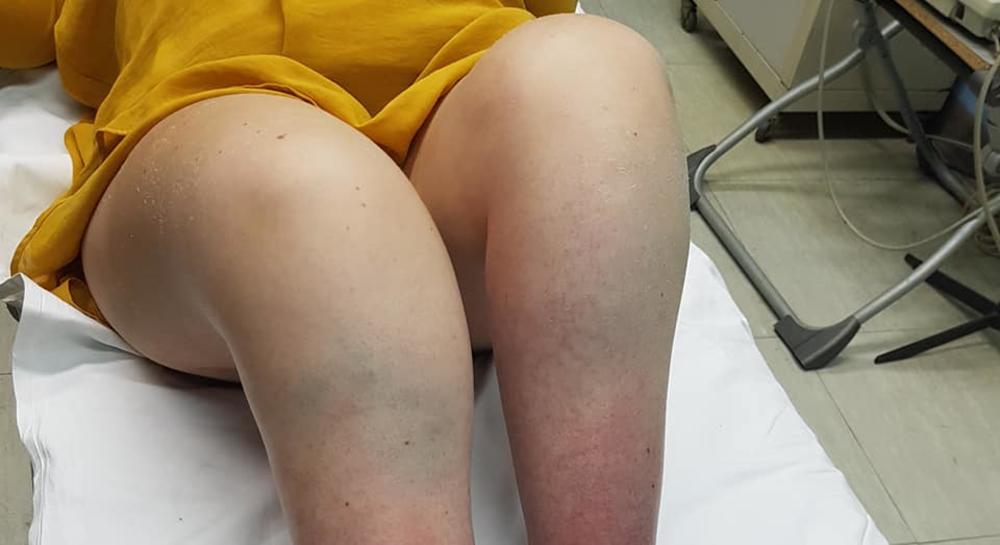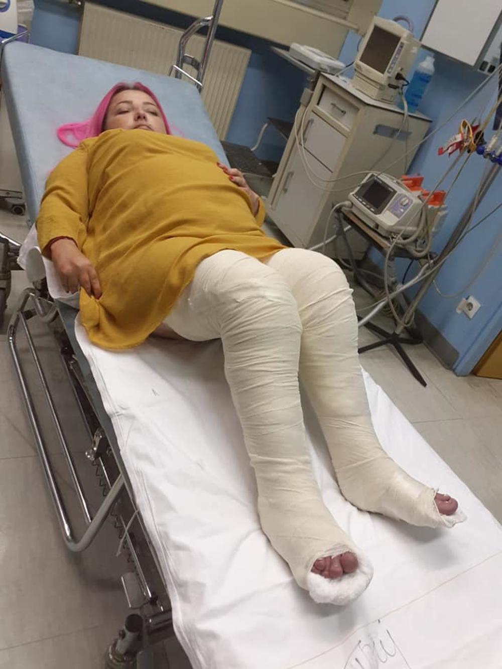 Na bolničkom stolu, fotografisala je noge koje su cele u modricama koje je zadobila tokom pada. Naime, dijagnostifikovano je da je tokom pada zadobila prelom obe potkolenice.