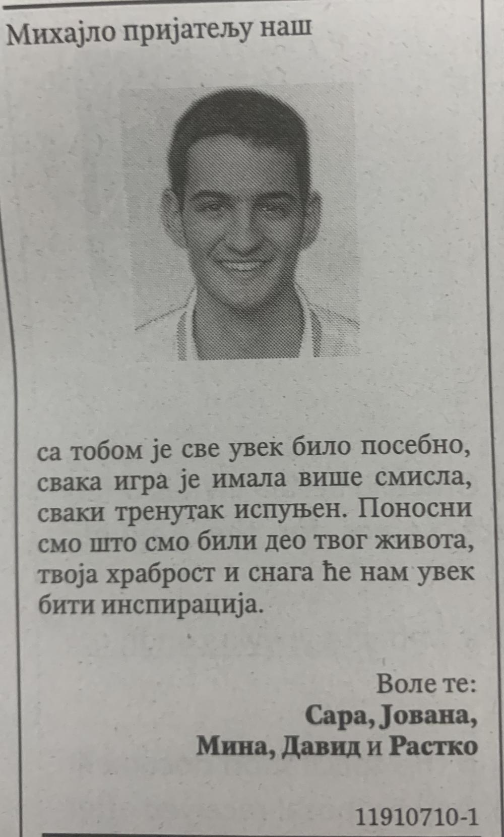 - Sa tobom je sve uvek bilo posebno, svaka igra je imala više smisla, svaki trenutak ispunjen. Ponosni smo što smo bili deo tvog života, tvoja hrabrost i snaga će nam uvek biti inspiracija - stoji u čitulji.