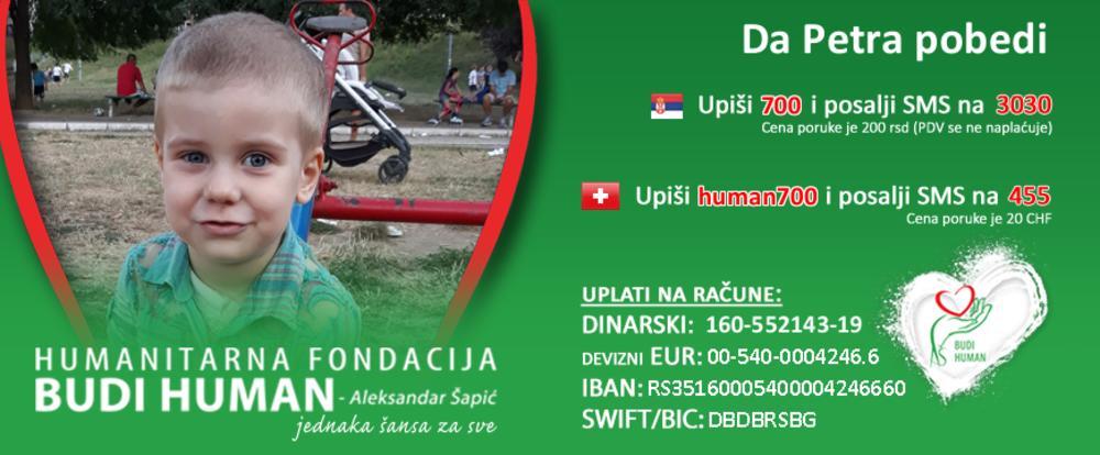 Ovim putem molimo sve ljude dobre volje da pomognu Petri novčanim sredstvima kako bi nastavila svoje detinjstvo kao zdrava i srećna devojčica.