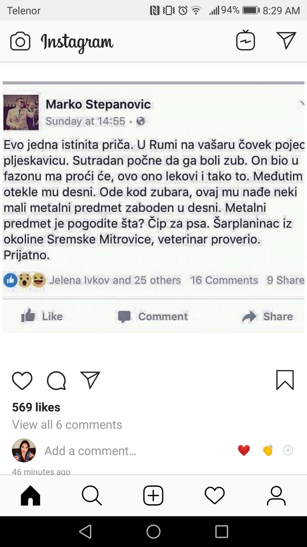 - Evo jedna istinita priča. U Rumi na vašaru čovek pojeo pljeskavicu. Sutradan počne da ga boli zub. On bio u fazonu, ma proći će, ovo, ono, lekovi i tako to. Međutim, otekle mu desni. Ode kod zubara, ovaj mu nađe neki mali metalni predme zaboden u desni. Metalni predmet je pogodite šta? Čip za psa. Šarplaninac iz okoline Sremske Mitrovice, veterinar proverio. Prijatno. - napisao je jedan čovek na Tviteru.