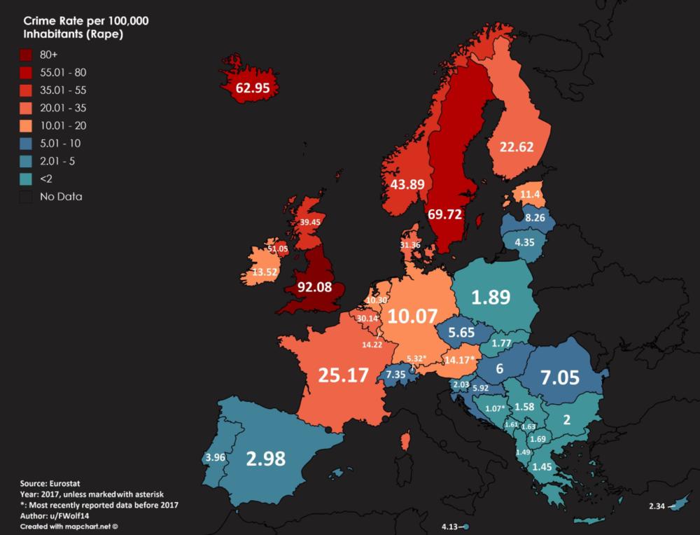 Koliko goda da su ove brojke poražavajuće još uvek su daleko manje u odnosu na ostale zemlje. Naime, postoji karta koja slikovito prikazuje procenat silovanja na 100.000 stanovnika.