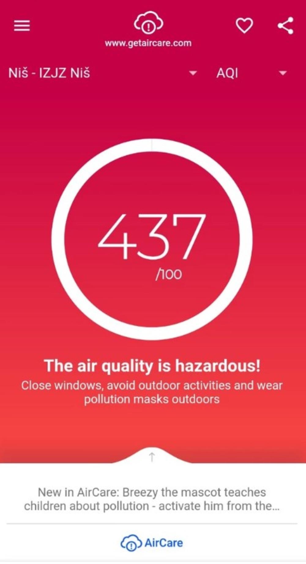 Grad Niš juče je u večernjim časovima bio najzagađeniji grad u Evropi, pokazuju podaci stranih sajtova za merenje zagađenja vazduha. Po njima je u jednom trenutku izmereno zagađenje u Nišu bilo 343, a u drugom čak 437 jedinica po AQI (međunarodnom indeksu zagađenja).