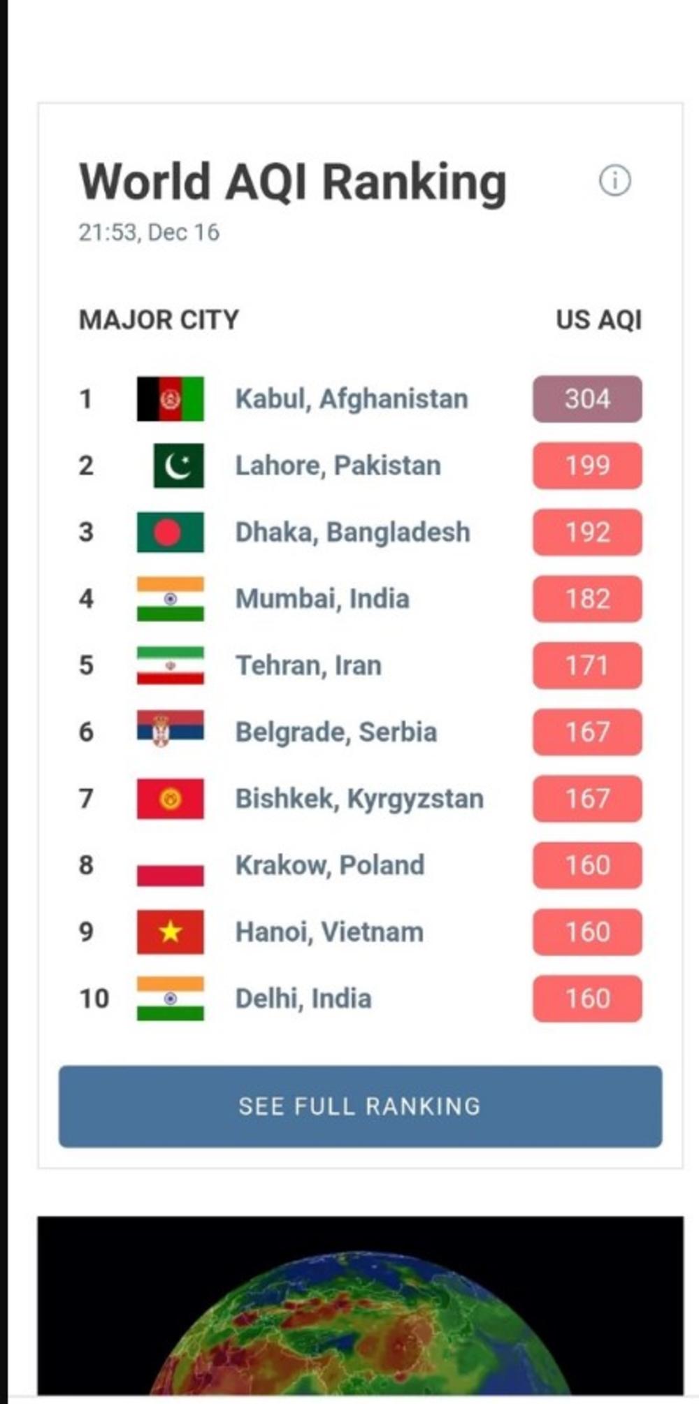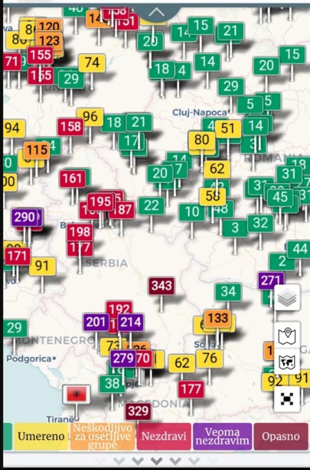 Zagađenje se tokom noći smanjilo, pa je sada nešto manje (217, po najnovijim podacima), ali Beograd se u međuvremenu na listi najzagađenijih većih svetskih gradova sa šestog popeo na 5. mesto.