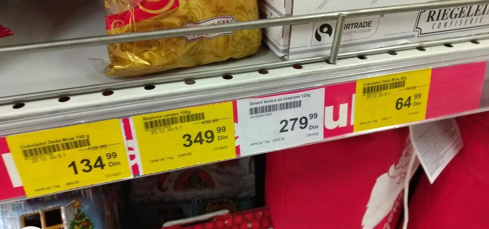 Hrana koja je naznačena na popustu i jeste na popustu, ali izgleda da praznici ne utiču na sve proizovde, dosta namirnica ima svoju redovnu cenu, međutim ne možemo to nazvati obmanom jer nigde nije ni naglašeno da će biti jeftinija nego inače, jedino što možemo da zaključimo je da nije sve sniženo zbog nove godine, već samo određene stavke.