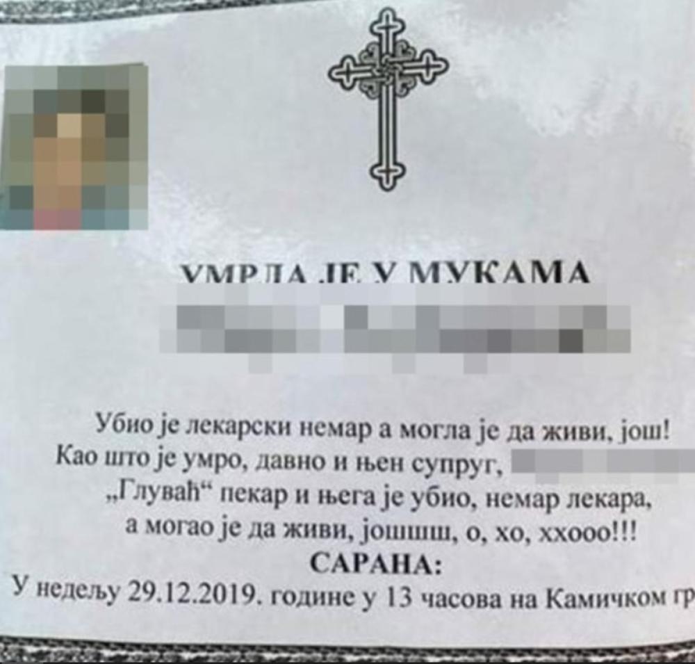 Naime, rođaci jedne bake objavili su umrlicu u kojoj su lekara okrivili za smrt svoje rođake.