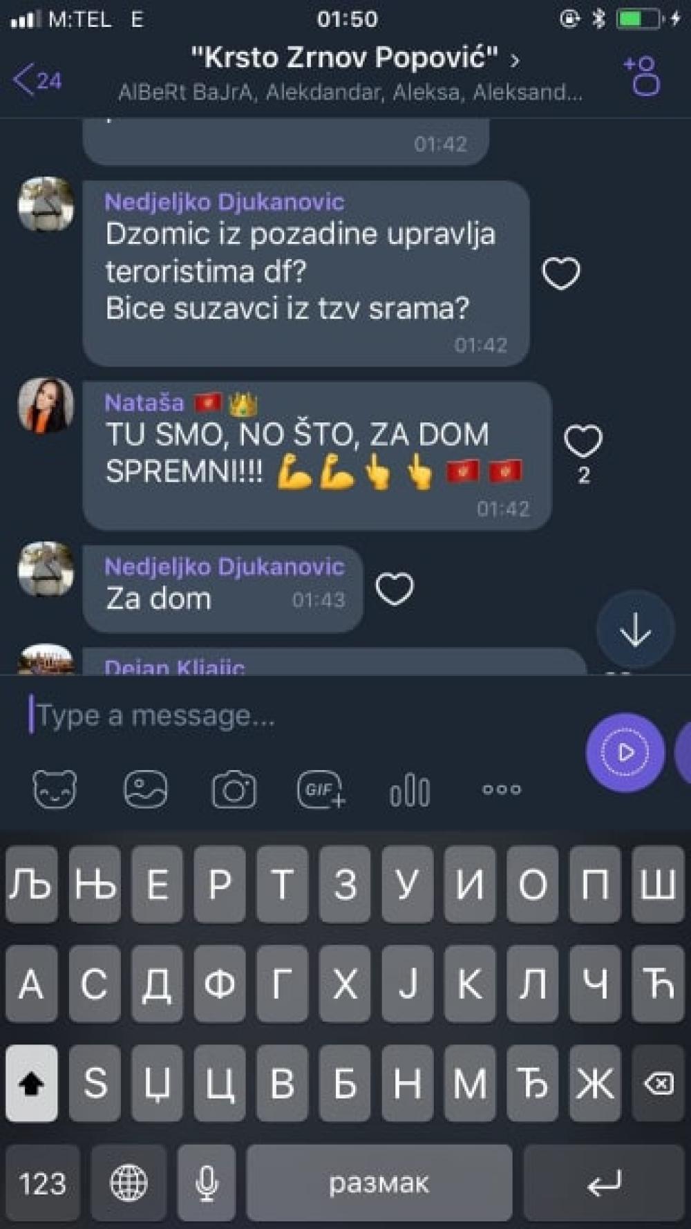 Nazivajući Srbiju "smrbija" u istoj grupi predviđaju da bi "mogla biti potučena gore nego 1999.". Pišu članovi grupe i da bi im od pomoći bile u određenim okolnostima kakvih se plaše, sve države iz okruženja koje su članice NATO-a (Albanija, Hrvatska, Italija, Slovenija...) "a sumnjam da nebi i Kosovo bilo u odbrani CG od srbofašizma" - piše jedan od članova viber grupe.
