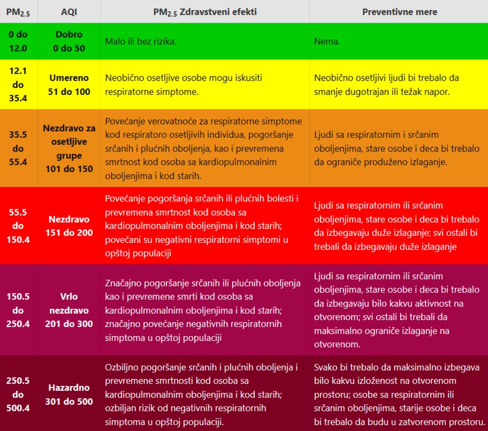 To je zato što potencijalna šteta nastala pod dejstvom vazdušnih zagađivača zavisi ne samo od koncentracije, već i od perioda izloženosti. Što ste duže izloženi prema PM2.5 to je veći rizik za razvijanje negativnih efekata izazvanih izlaganjem. I zato je dvadesetčetvoročasovna mera prikazuje bolji odraz na zdravstvene efekte finih čestica nego npr. jednočasovna mera. The table below will give you a sense of what levels of PM2.5 are harmful and the appropriate precautions you need to take. It is based on the air quality standards for particle pollution published by the U.S. Environmental Protection Agency.