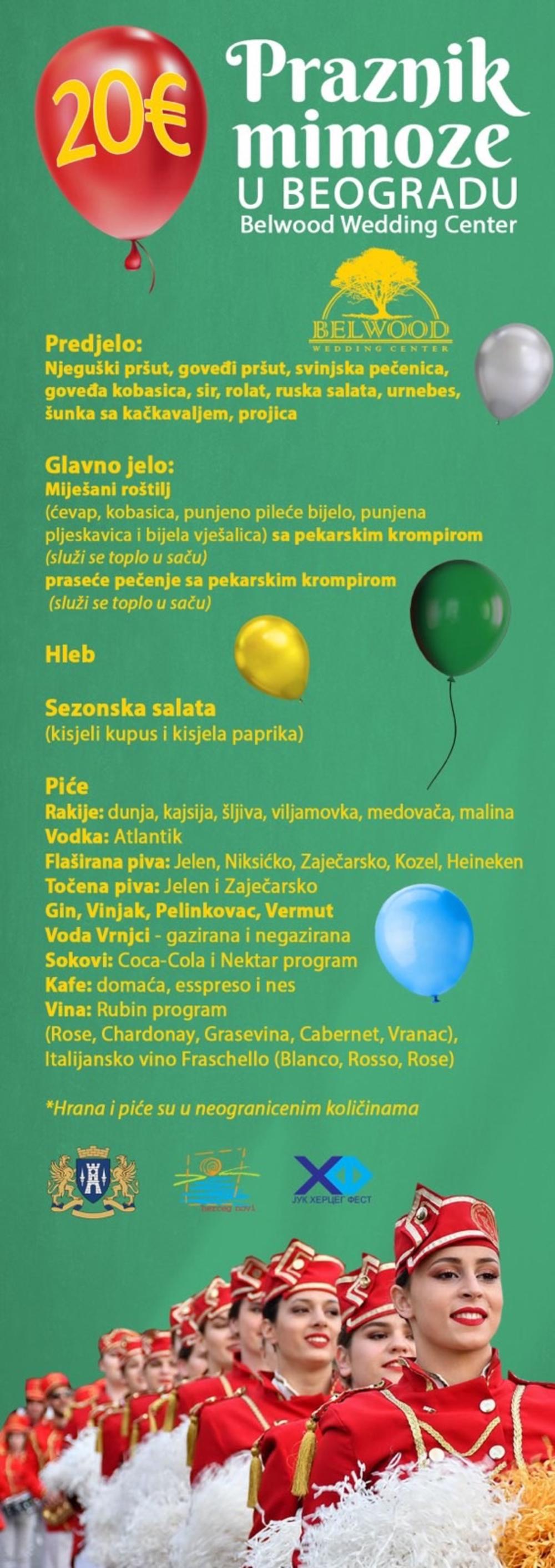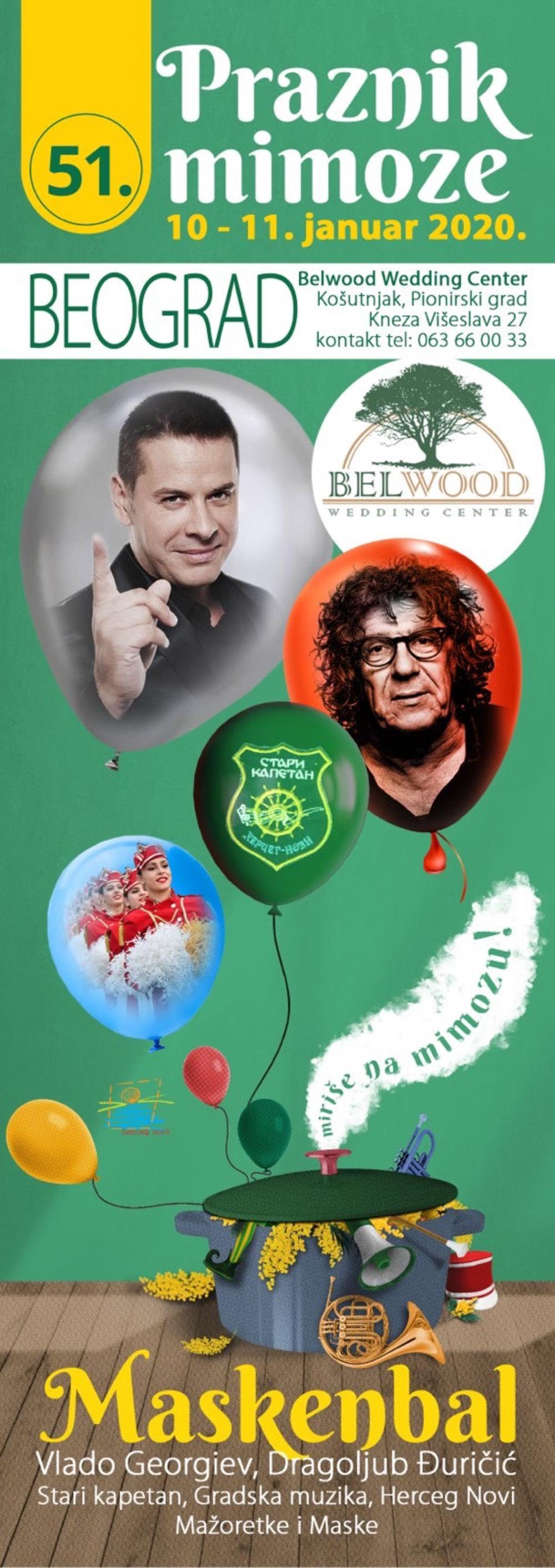 Vlado Georgiev i Dragoljub Đurićić vas zabavljaju na maskenbalima obje večeri uz Gradsku muziku Herceg Novi, mažoretkinje i klapu Stari kapetan, sa početkom u 20 časova u Belwood wedding centru na Košutnjaku. Na taj način najavljuju 51. Praznik mimoze i bogat zabavni i muzički program. Uzivajte uz bogat meni, rezervišite vaše mesto na vreme pozivom- broj telefona 063 66 00 33.