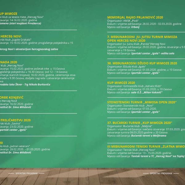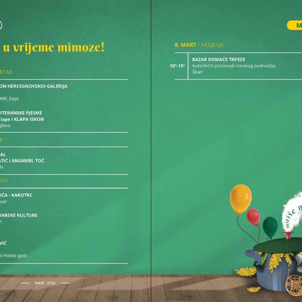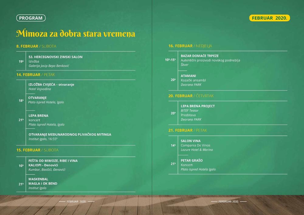 14. februara na Dan zaljubljenih spektkularnim koncertom Lepe Brene otvoriće se 51. Praznik mimoze u Herceg Novom dok nas 15. Februara očekuje tradicionalna Fešta od mimoze, ribe i vina na hercegnovskoj rivijeri i koncert Kaliopi. Poznate zvezde regiona nastupaće u Herceg Novom kao što su - Petar Grašo 21. februara, Vlado Georgijev-29. februara, Aco Pejović 07. marta, a 14. marta Praznik mimoza će zatvoriti Međunarodna karnevalska povorka i koncert Željka Joksimovića. Ne samo veliki koncerti,veliki broj posetilaca privućiće i Donatorski bal pod maskama uz bend Ane Štajdohar, interesantan Salon vina, kao i Bazari domaće trpeze, izložbe i pozorišne predstave, te maskenbali na kojima će prisutne zabavljati Dejan Matić, OK bend i Magla bend. Tu je još i tradicionalna Riblja večera zakazana za 22. februar uz grupu Magazin, dok će na Škveru biti upriličeno još pet fešti ribe i vina. Neće izostati ni sportski programi i sadržaji za decu koji su godinama sastavni deo Praznika mimoze.