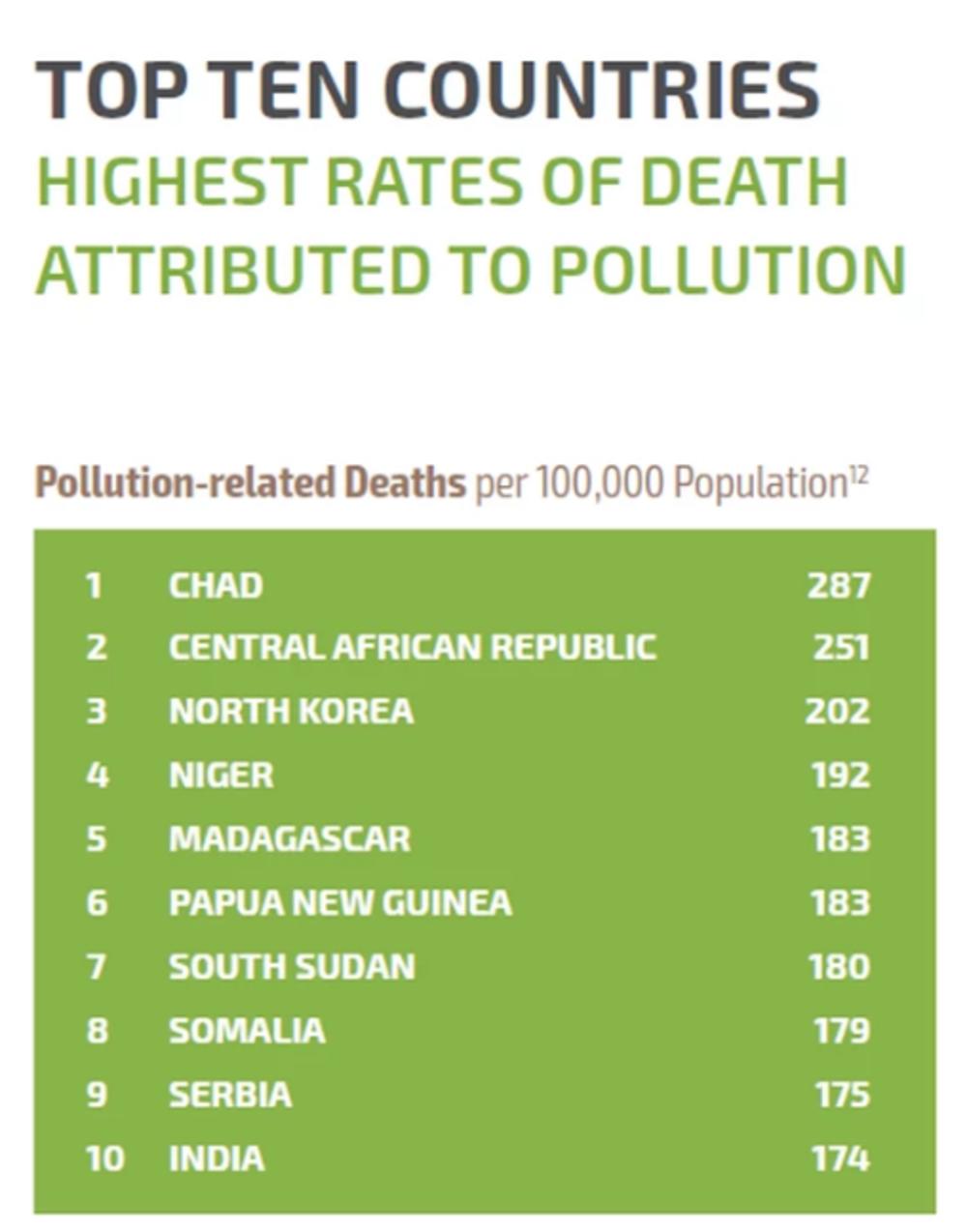 To što u našoj zemlji godišnje 175 ljudi na 100.000 prevremeno umre usled nekog zagađenja kome je izloženo u svom okruženju, svrstalo nas je na crnu listu - deveti smo u svetu po umiranju od posledica zagađenja, čak smo za jedno mesto ispred Indije, a ubedljivo prvi u Evropi!