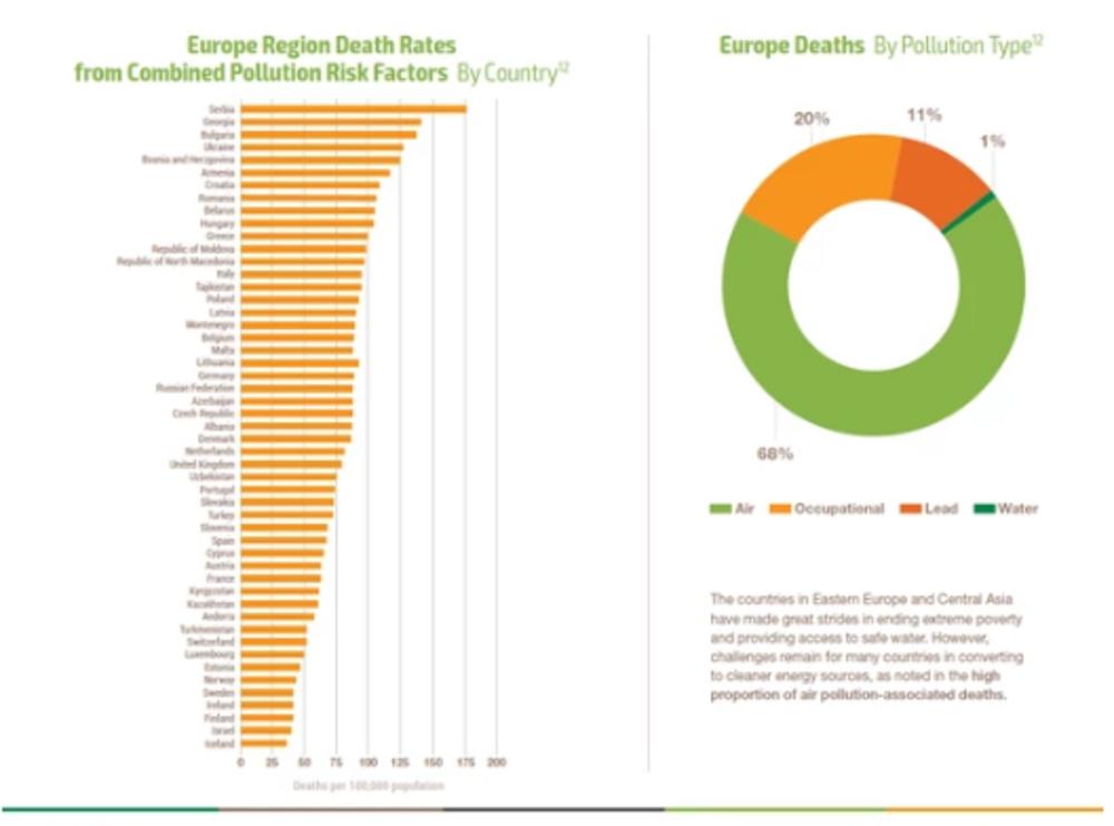 Srbija je prva u Evropi po smrtnosti od posledica različitih vidova zagađenja, ponajviše zbog zagađenog vazduha, deveta je u svetu, a 175 osoba na svakih 100.000 ljudi umre zbog izloženosti štetnim materijama
