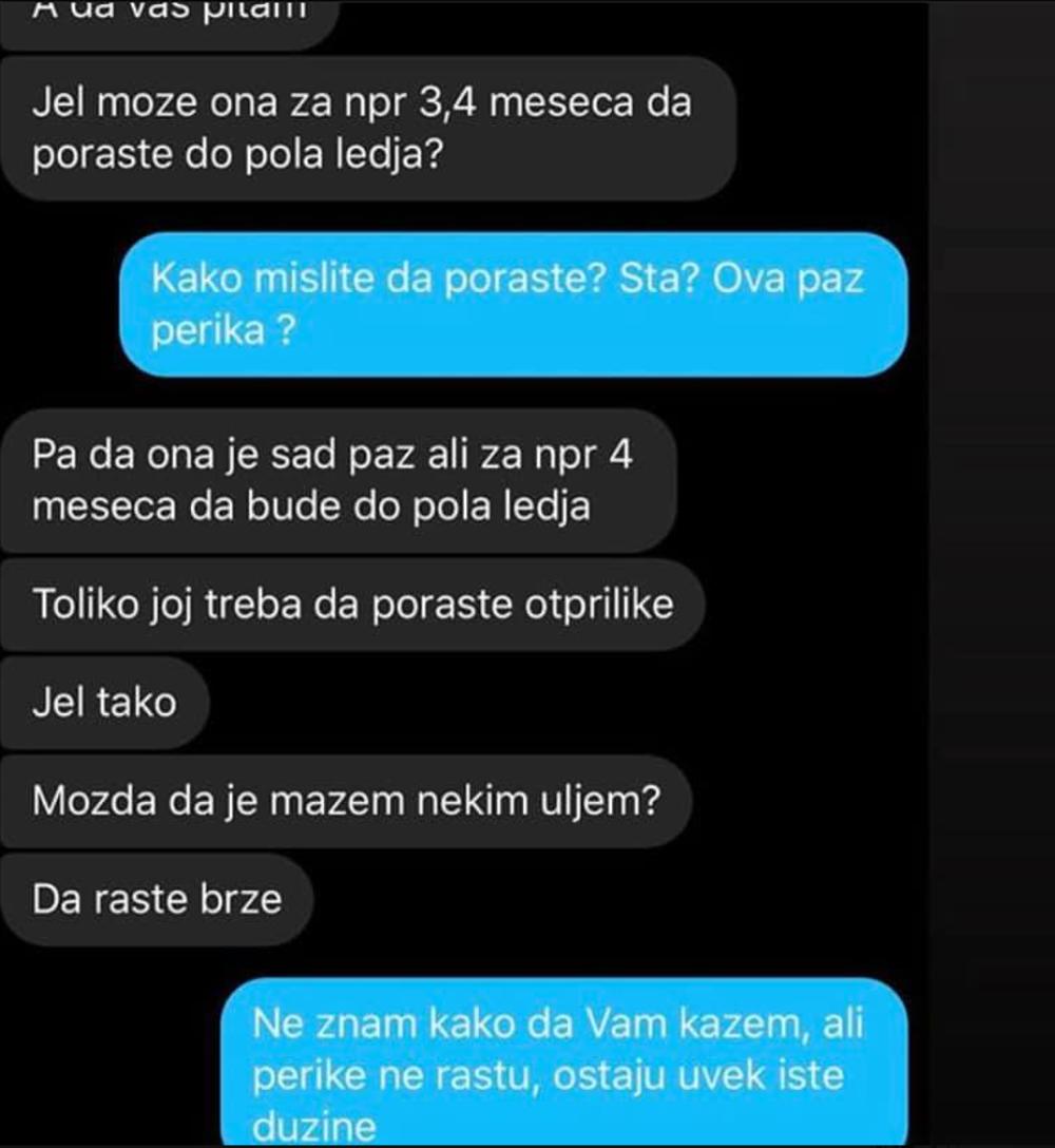Jedna od žena obratila se preko četa prodavcima perika sa pitanjem o tome da li perika "za 3-4 meseca može da naraste do pola leđa".