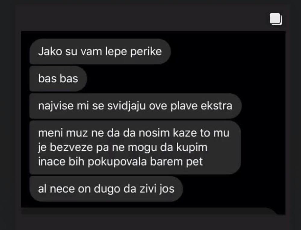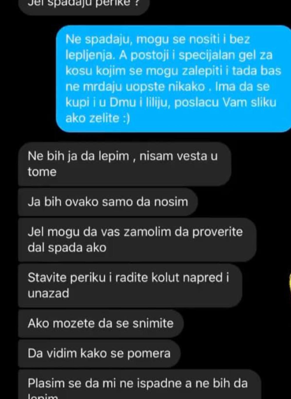 No, tu nije kraj biserima. Jedna od zainteresovanih za perike pisala je na čet trgovkinji pokazujući interesovanje za perike. Nakon toga dobila je odgovor kako će biti obaveštena o tome kada perike stignu pa da može lepo da bira. Žena se javila i drugi put, no ne da bi poručila periku, nego da bi obavestila kako se "razvela od muža".