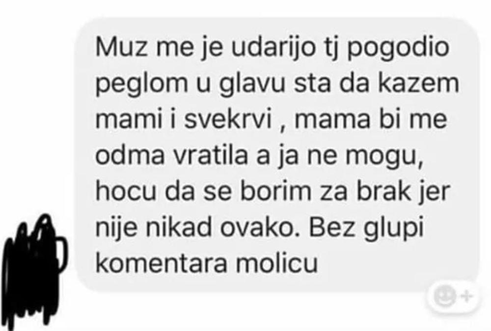 - Muž me je udario, tj. pogodio peglom u glavu, šta da kažem mami i svekrvi, mama bi me odma vratila, a ja ne mogu, hoću da se borim za brak jer nije nikad ovako. Bez glupih komentara, moliću. - napisala je ona, dok su je mnogi osudili zbog ovog.