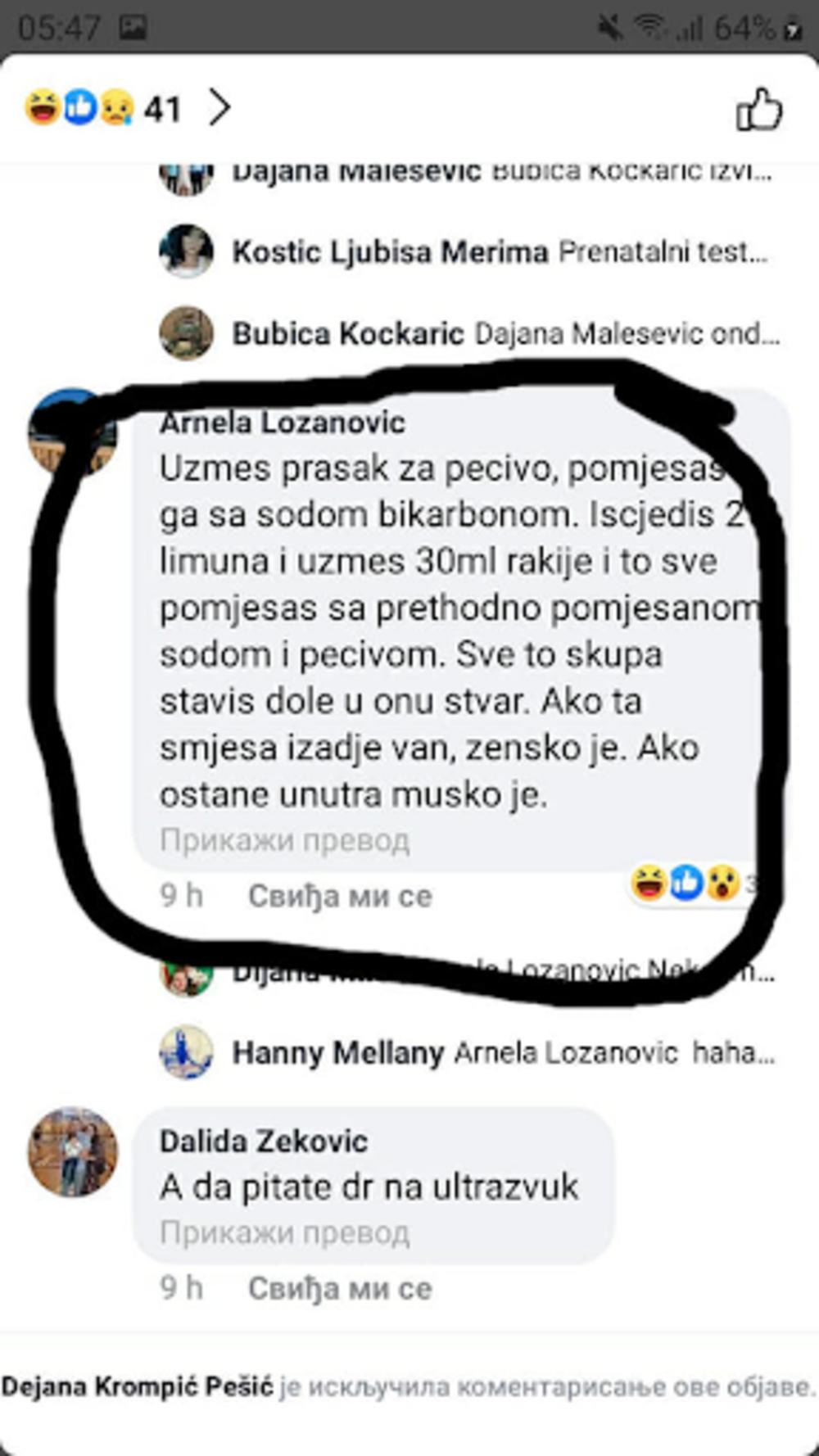 - Uzmeš prašak za pecivo, pomešaš ga sa sodom bikarbonom, iscediš dva limuna i uzmš 300 ml rakije i to sve pomešaš sa prethodno pomešanom sodom i pecivom. Sve to zajedno staviš dole u onu stvar. Ako ta smesa izađe napolje, žensko je. Ako ostane unutra, muško je. - napisala je ona, dok su mnogi osudili njen vid otkrivanja pola.