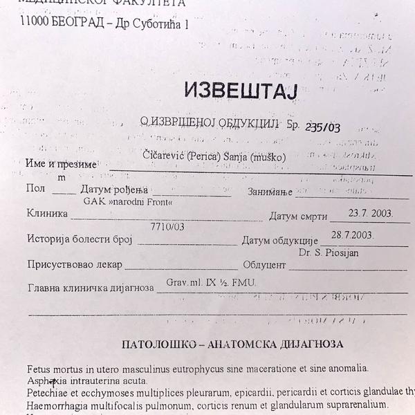 - Kako sve to funkcioniše?! Konkretno kada je Beograd u pitanju, uzimam moj slučaj za primer. Beba je preminula u GAK-u Narodni Front. Front je dužan da pozove JKP Pogrebne usluge da svojim vozilom preuzme leš bebe, kada ga preuzme prebacuje ga na Institut za patologiju radi obdukcije. Kada Institu uradi obdukciju, poziva opet JKP Pogrebne usluge da preuzme leš bebe i odveze u kapelu u Kliničkog centra Srbije iz koje opet njihovo vozilo prevozi dete do grobnog mesta. Na moj zahtev da mi JKP Pogrebne usluge izda potvrdu o tome da je moje dete sahranjeno, dobio sam potvrdu da moje dete nikada nije ni došlo do groblja. Dakle, u mom slučaju beba je dovezena na Institut za patologiju gde je urađena obdukcija, ali tela deteta nema. Postavlja se pitanje šta je Institut uradio sa telom mog deteta, kada ni mene, ni moju tadašnju suprugu niko nije pitao da li hoćemo da preuzmemo leš bebe kako bismo je sahranili ili da li to želimo da dozvolimo državi - priča Čičarević za Espreso.co.rs.