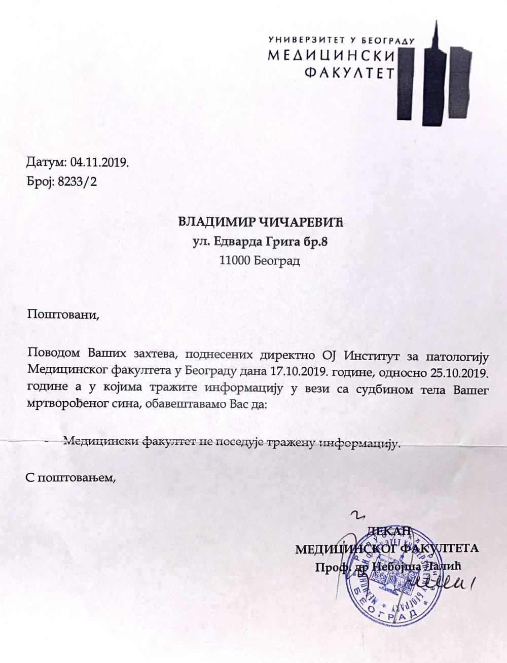 - Nakon što sam se žalio Zdravstvenoj inspekciji i nakon dva inspekcijska nadzora i nekoliko dopisa načelniku zdravstvene inspekcije, dana 04.11.2019. godine, dobijam dopis od Instituta za patologiju da ne poseduju informaciju o sudbini tela mog deteta, a oni su ti koji su izvršili obdukciju.
