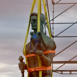 - Radovi na restauraciji skulpture su u toku. Na snimku se vidi postupak uklanjanja crnih kora sa bronzanog postolja metodom čišćenja suvim ledom (ugljen-dioksidom u čvrstom agregatnom stanju na temperaturi od -79 °C) - objavljeno je na Tviteru Pobednika.