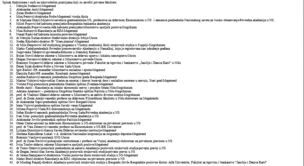 Ukoliko pogledamo spisak, vidi se da je veliki broj funkcionera završio privatne fakultete "Megatrend" i "Singidunum"...
