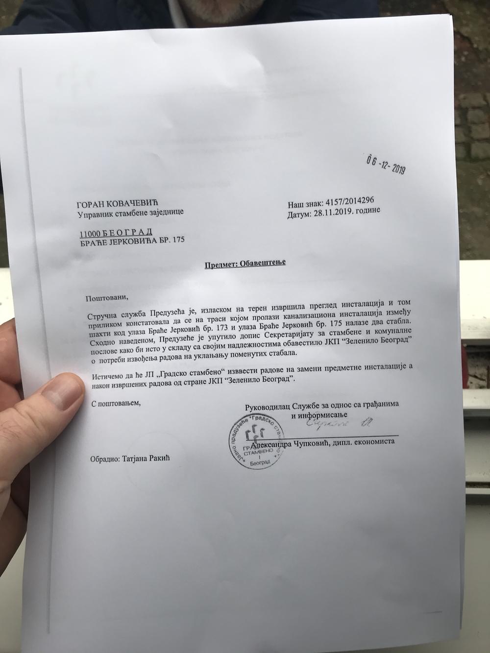 "Ovo je problem Gradskog Stambenog preduzeća koje koji je više puta izlazilo na teren. Gledali su okolo i slali podizvođaća Raskošnicu. Iako je sva dokumentacija pristigla iako su svi obaveštini o problemima koje imamo niko problem nije sistemski rešio," zaključio je on.