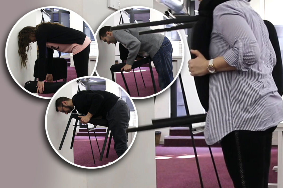 Poenta izazova je da se uspravite držeći stolicu na grudima.