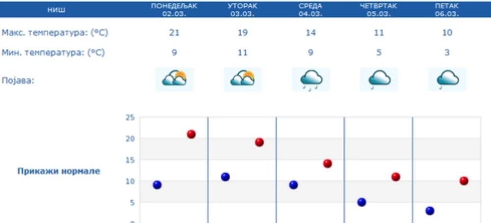 - Danas će najtoplije biti na jugu Srbije, u Nišu i Leskovcu, gde će maksimalna dnevna temperatura iznositi 21 stepen, što je veoma toplo za ovo doba godine. Temperature u ostalim gradovima kretaće se od minimalnih 10, do maksimalnih 20 - kažu za "Blic" iz RHMZ.