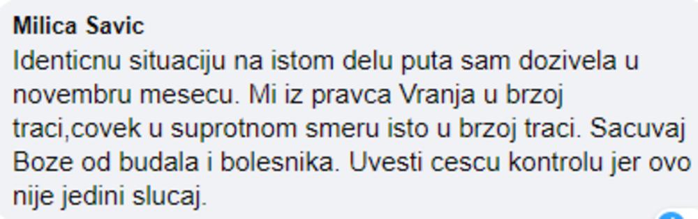 Ljudi su šokirani videom sa auto-puta Vladičin Han-Vranje. Naime, na snimku se jasno vidi vozilo koje se kreće suprotnom trakom. Da stvar bude još opasnija, kreće se takozvanom ,,brzom trakom'':