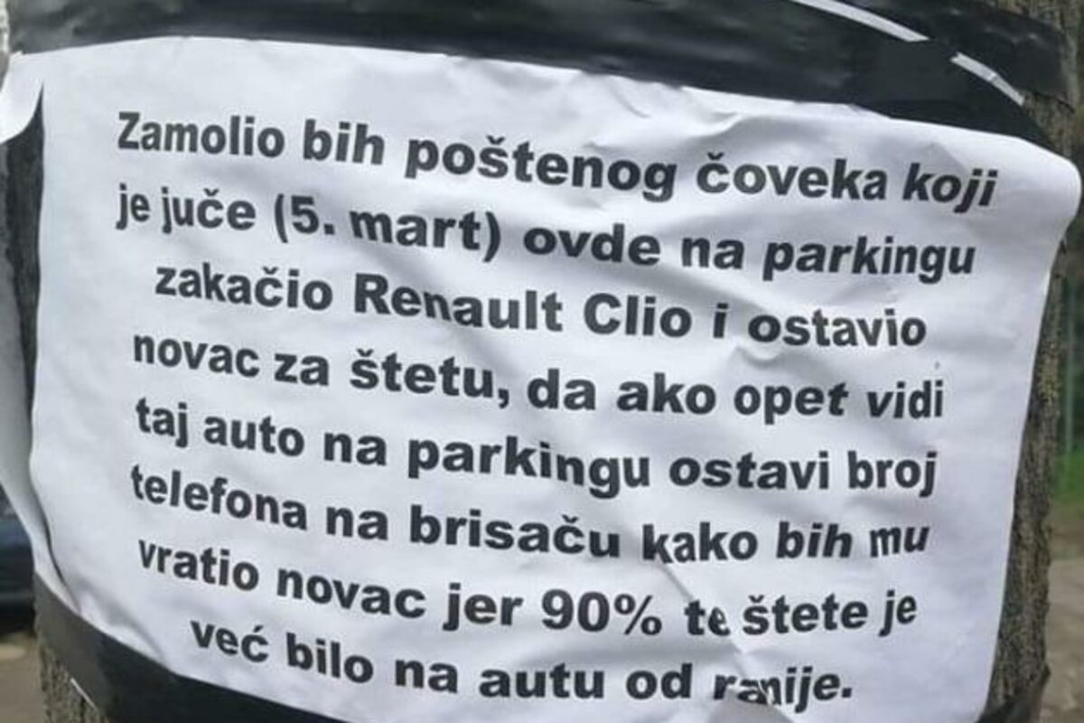 - Zamolio bih poštenog čoveka koji je juče (5. mart) ovde na parkingu zakačio Renault Clio i ostavio novac za štetu, da ako opet vidi taj auto na parkingu ostavi broj telefona na brisaču kako bih mu vratio novac jer 90% te štete je već bilo na autu od ranije- napisao je anonimni vlasnik udarenog automobila.