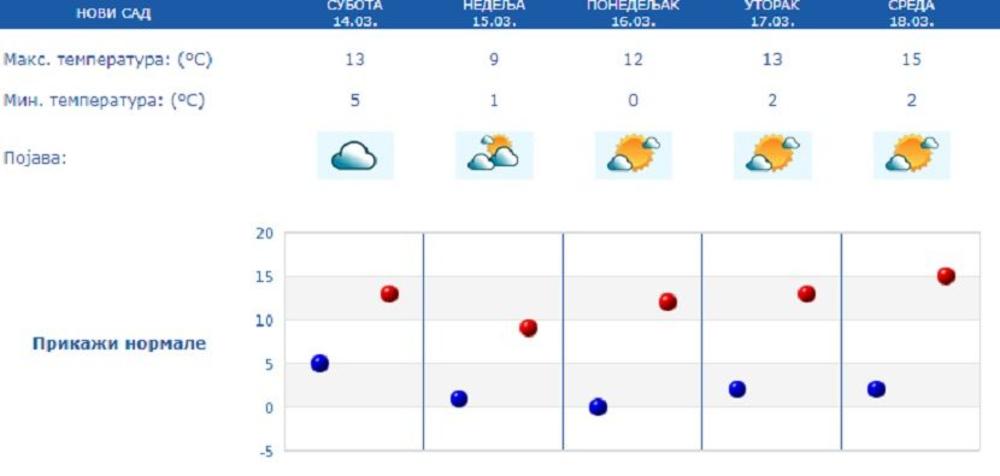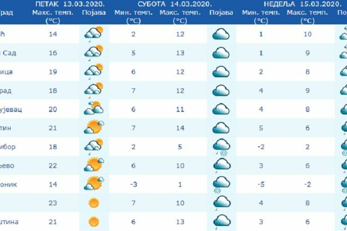 U Srbiji je danas u većini krajeva sunčano i toplo sa maksimalnom temperaturom i do 25 stepeni, dok se za vikend očekuje zahlađenje i pad temperature za 10 do 15 stepeni. Od ponedeljka se očekuje pravo prolećno vreme, a mart i april biće natprosečno topli za ovo doba godine.
