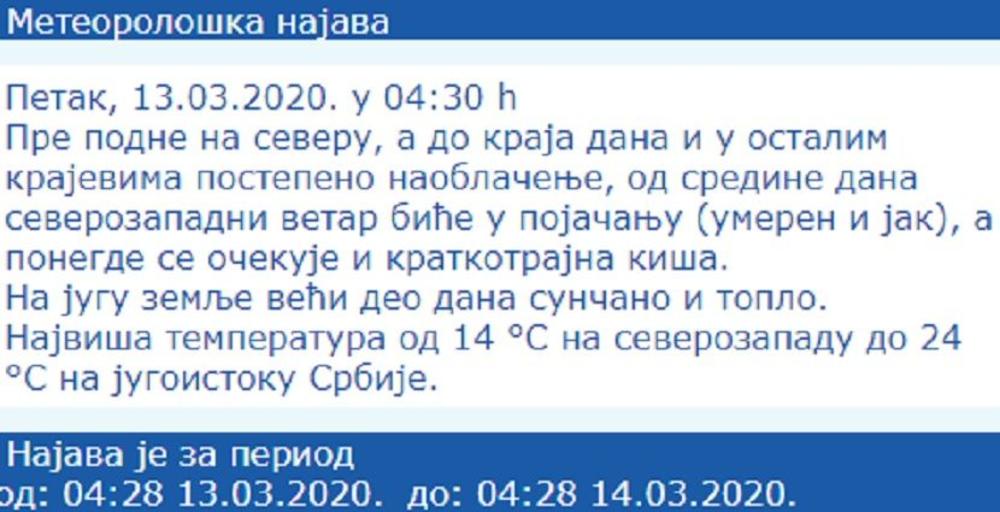 Na severu će biti umereno oblačno i suvo, a vetar će biti slab i umeren, severni i severozapadni, sa najnižom temperaturom od 2 do 7 stepeni. U Beogradu će biti pretežno oblačno, suvo i hladnije. Vetar slab i umeren, severni i severozapadni. Najniža temperatura 7, najviša 12 stepeni.