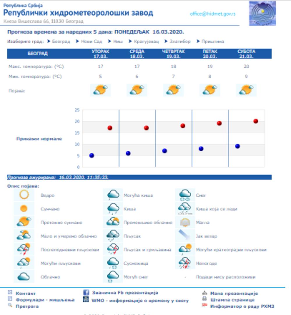 Jutarnja temperatura od -3 do 5, najviša dnevna od 15 do 18 stepeni.