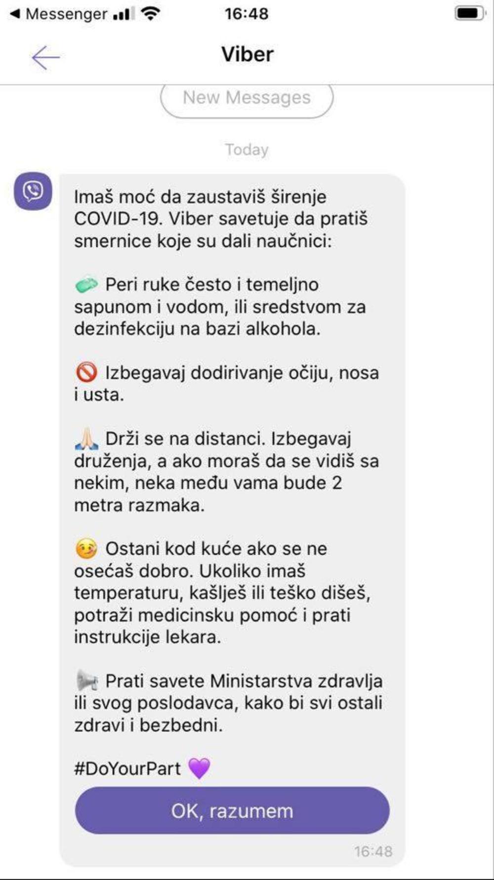 Viber aplikacija poslala je svim korisnicima identičnu, generičku poruku u kojoj, na srpskom jeziku, upozorava na neophodnost pridržavanja mera zaštite protiv korona virusa.
