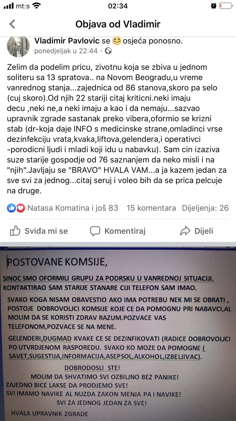 Naime, kako je u svom postu objavio, upravnik jedne zgrade na Novom Beogradu, koja ima čak 86 stanova, sazvao je sastanak putem vibera i osnovao krizni štab. Članovi kriznog štaba su omladinci koja dezinfikuju kvake vrata, liftove, gelendere, operativci koji idu u nabavku,a tu je i jedna doktorka koja daje medicinske savete.