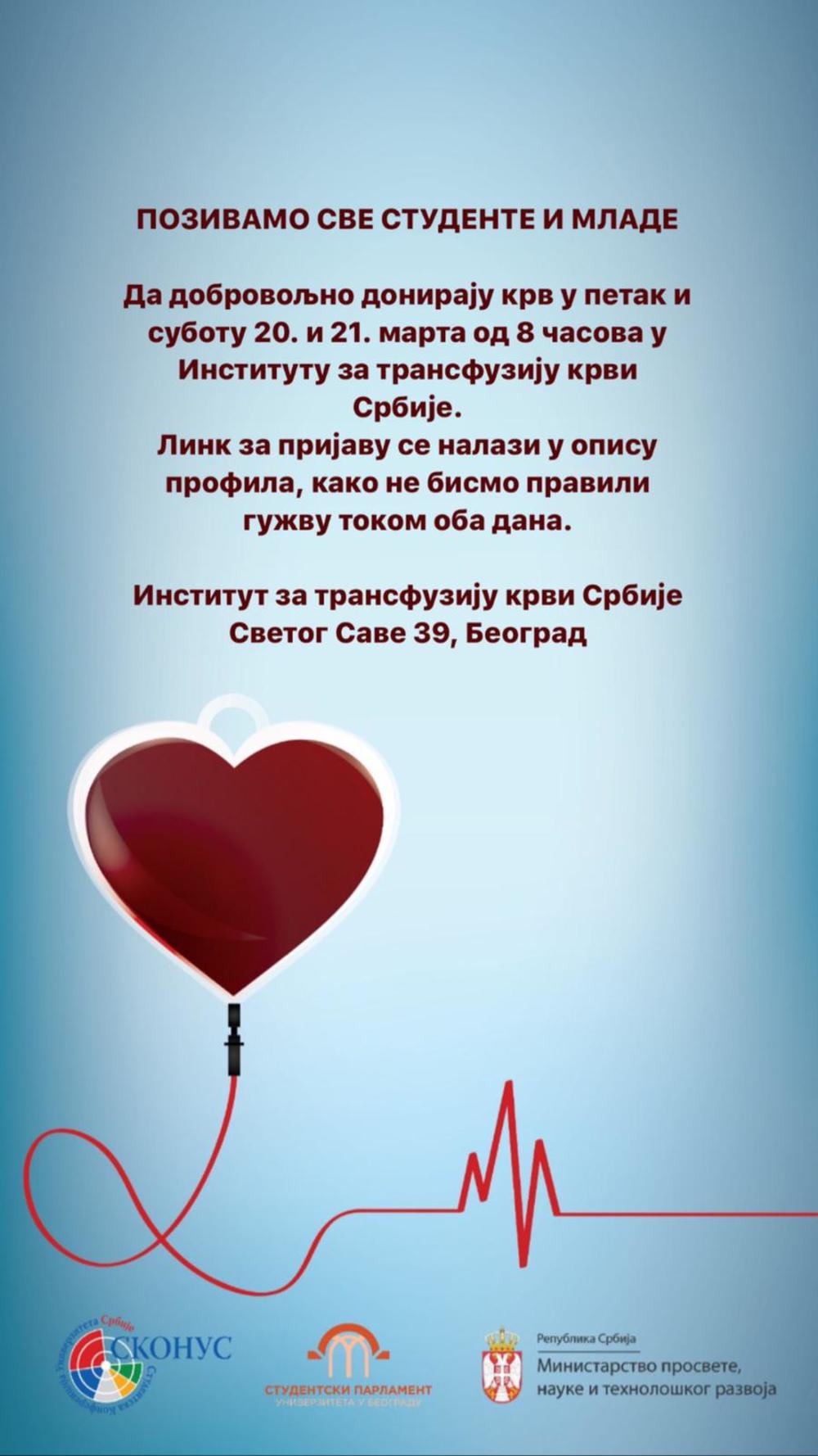 SKONUS i Studentski parlament u saradnji sa Ministarstvom prosvete, nauke i tehnološkog razvoja organizovalo je dobrovoljno donirate krv u petak i subotu 20. i 21. marta od 8 časova u Institutu za transfuziju krvi (ulica Svetog Save 39, Beograd).