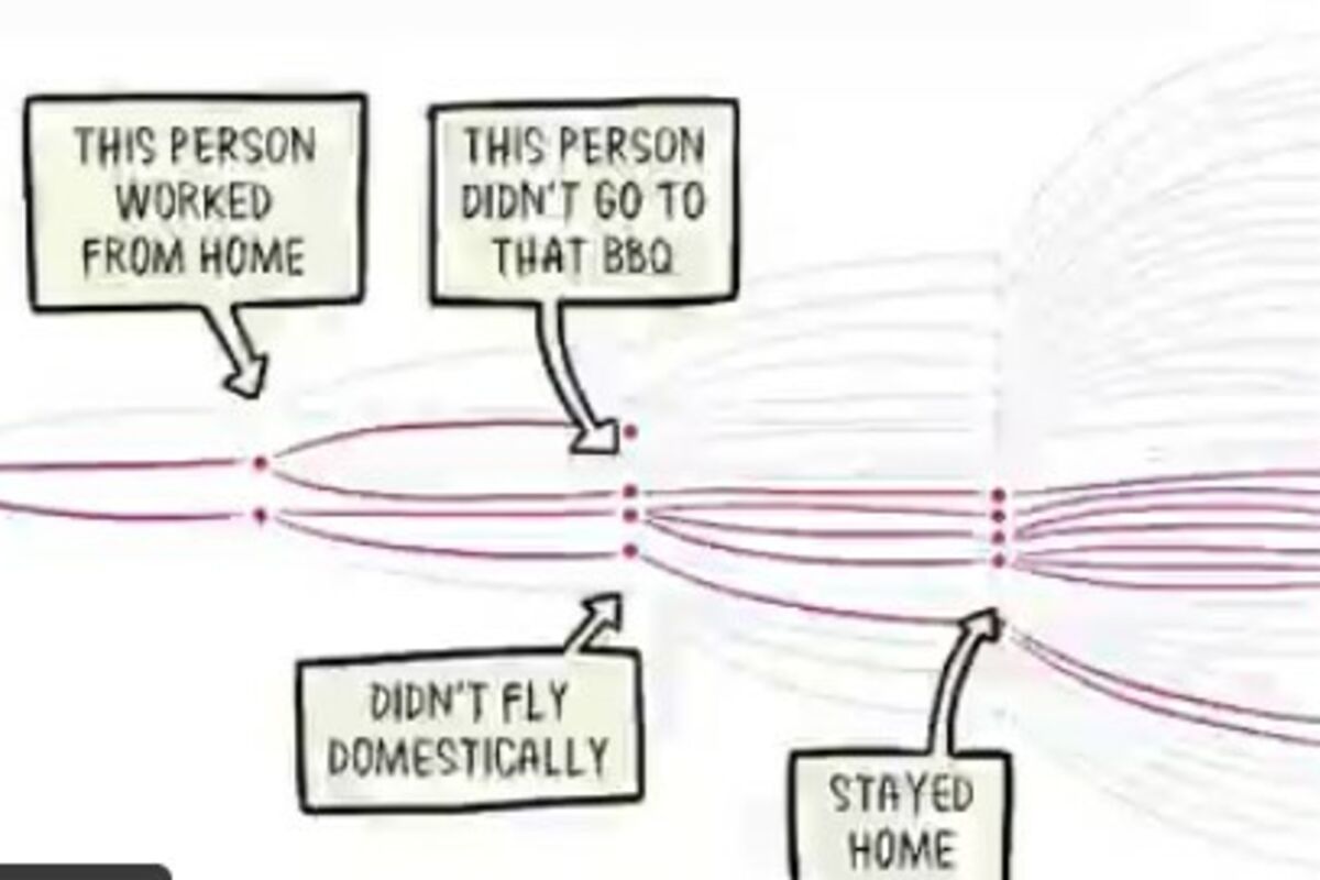 Na ilustraciji ispod možete videti da ukoliko ostanemo kod kuće, radimo od kuće i ne izlazimlo napolje male su šanse da se zarazimo.