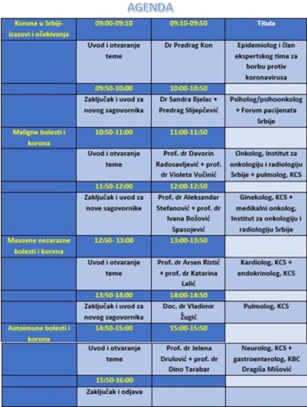 Ova jedinstvena web konferencija biće organizovana u petak, 27. marta od 9 do 16 sati, uz podršku istaknutih lekara svih specijalnosti, koji će, pored psihološke pomoći, pričati o uticaju korona virusa na druge bolesti i pružiti odgovore na brojna pitanja pacijenata koji su oboleli od malignih oboljenja, autoimunih i hroničnih nezaraznih bolesti. Sa jednog mesta, u sve domove u našoj zemlji, čuće se glas naših najboljih lekara, ali i predstavnika udruženja pacijenata.