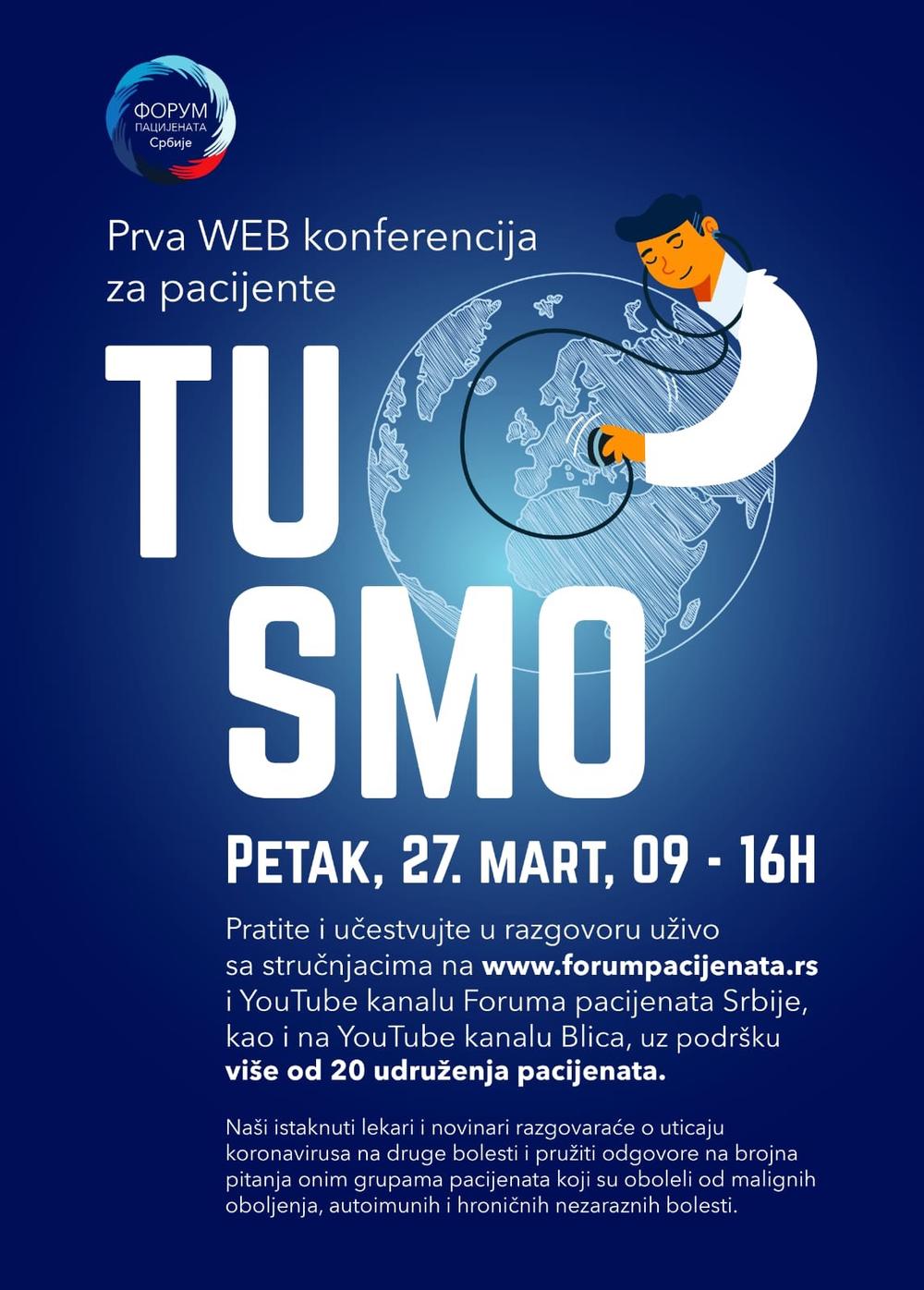Kako bi se smanjio pritisak na zdravstvene ustanove i lekare, pružila podrška i pravovremene informacije, Forum pacijenata Srbije, koji okuplja veliki broj pojedinačnih udruženja pacijenata, organizuje prvu Web konferenciju za pacijente, pod nazivom „TU SMO“.