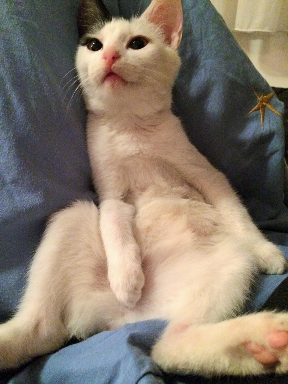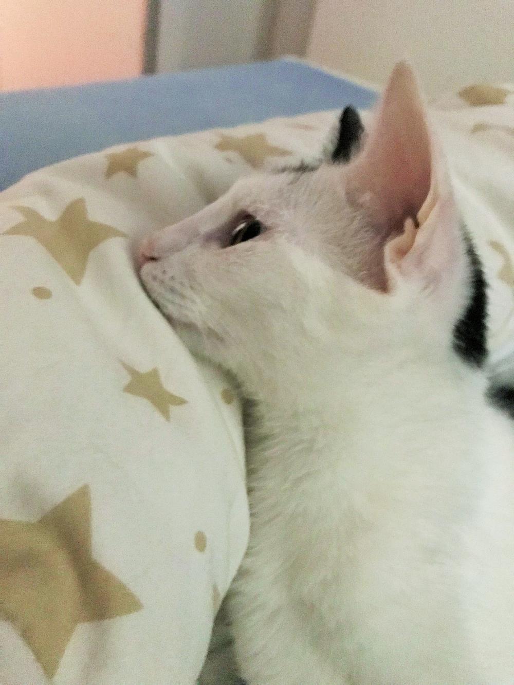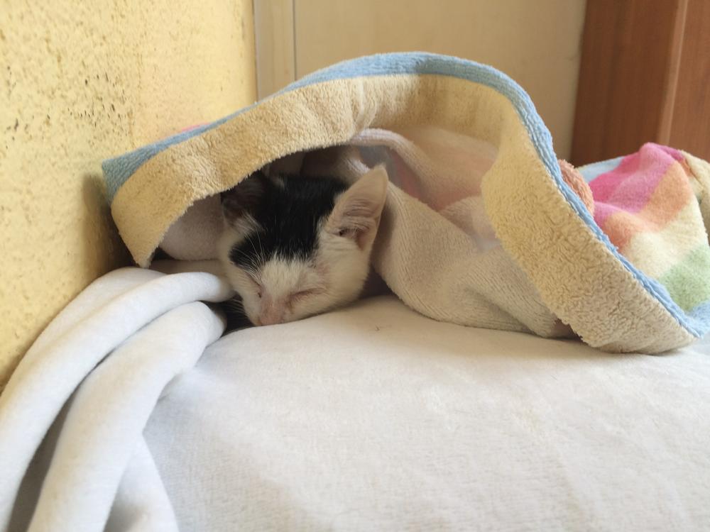 Na njeno insistiranje, dali su joj mače da ga ponese (jer nisam čipovana i sterilisana). Sigurno je bilo da su mi sati odbrojani i da to neću ni dočekati, tako da su me ipak dali. Odvela me kod veterinara koji je ostao šokiran da sam uopšte živa. Neurološko oboljenje, gljivična infekcija očiju i kože, upala pluća, ljuštenje epitela debelog creva. Dobila je obećanje da će pokušati da me izleči, ali su im rekli da se ne vezuju previše.